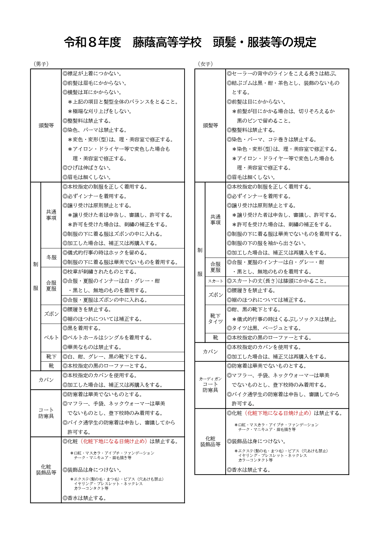 令和8年度 頭髪・服装の規定
