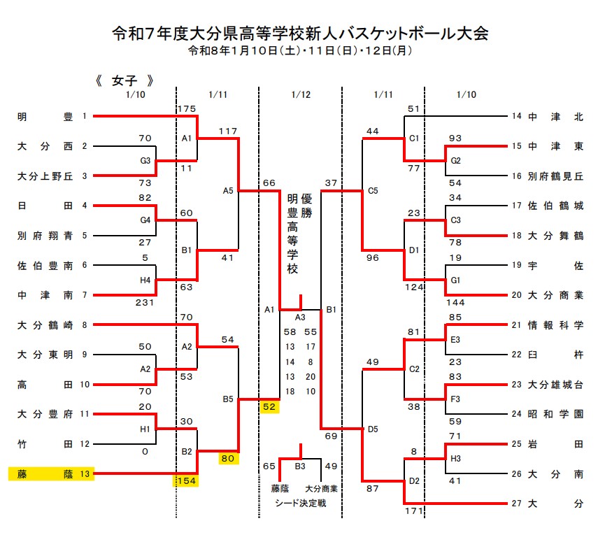 | 藤蔭高校 | ○98-51 | ●55-64 | ●82-92 |