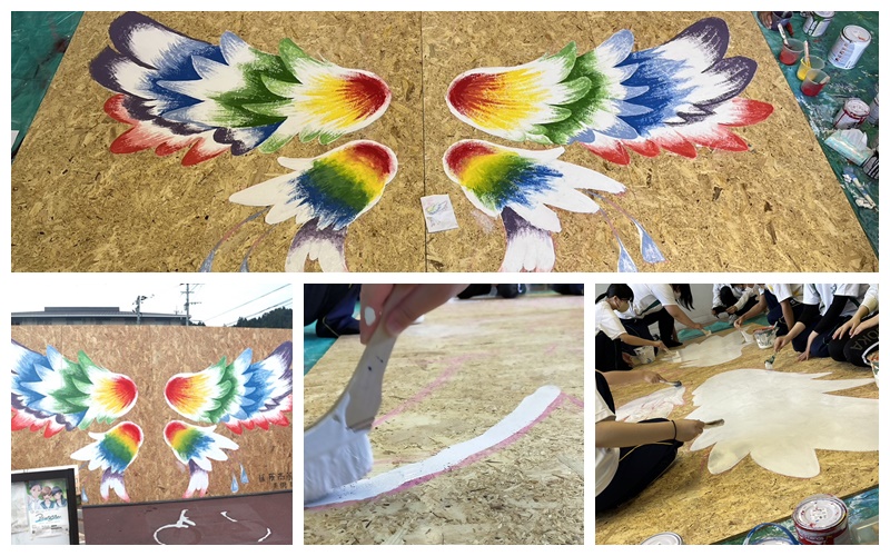 🏫日田市のある公園でお祭りがあり、そのイベントで藤蔭高校美術部に👼エンジェルウィングを描いてほしいという依頼を祭主催の自治会長さんから受け、🌈虹色の羽を描かせていただきました。 X(Twitterより引用)