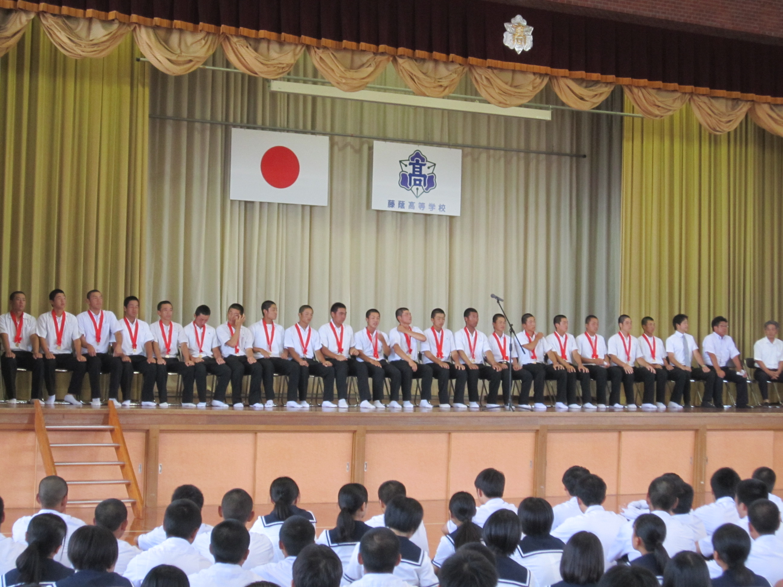 前日の柳ヶ浦高校との接戦を制し、28年ぶりの甲子園出場を決めましたが、早速全校生徒の前で優勝報