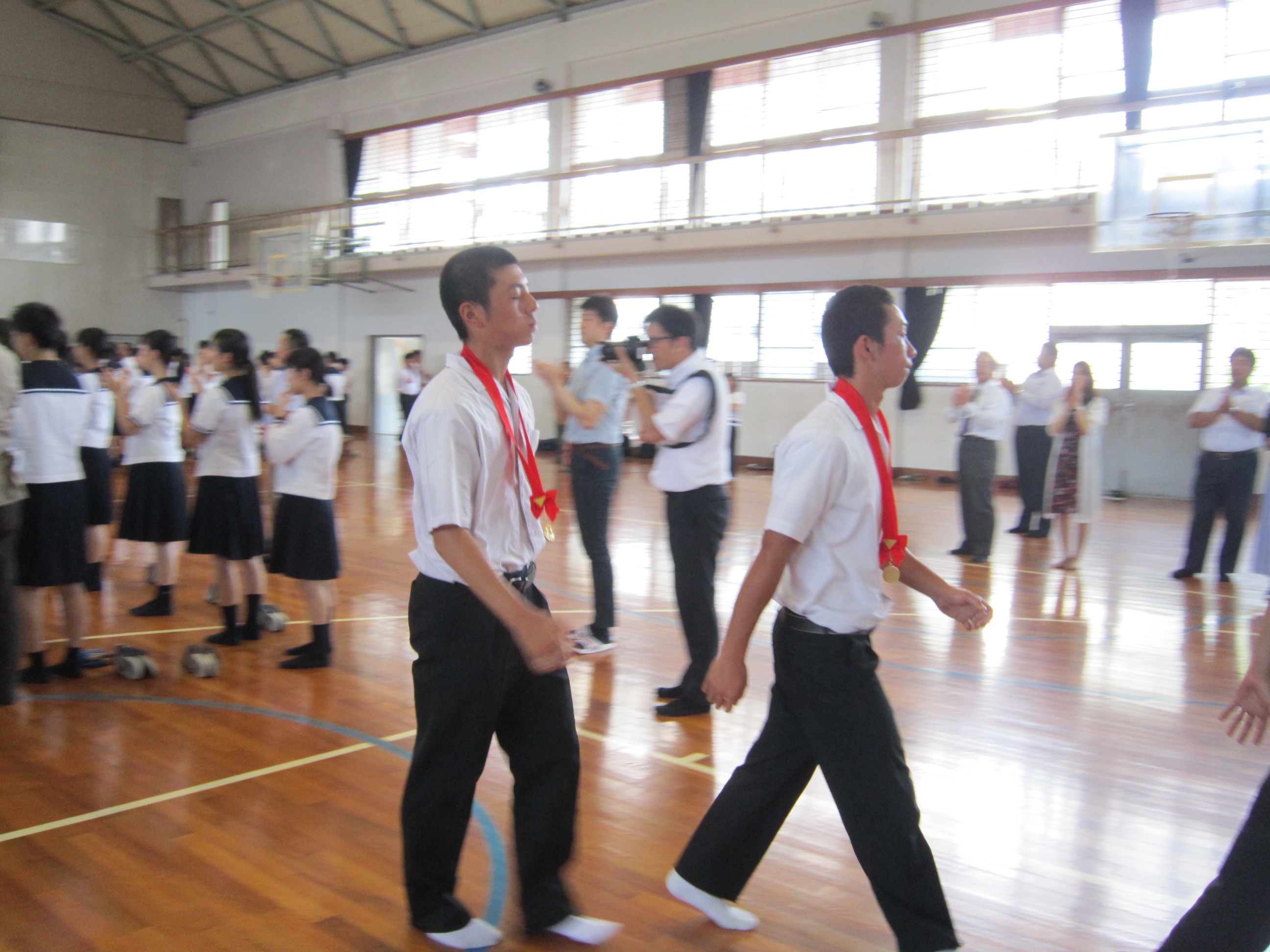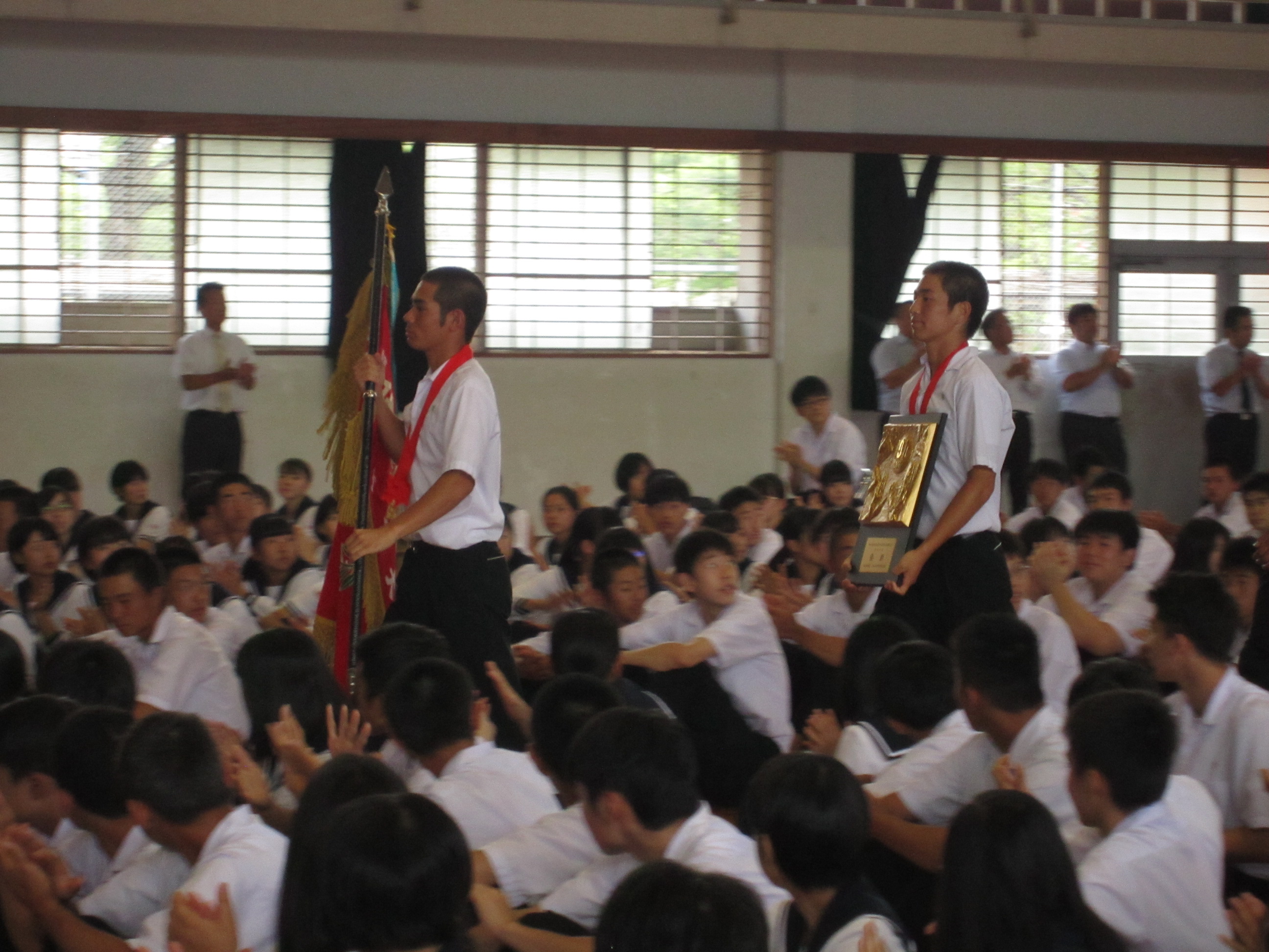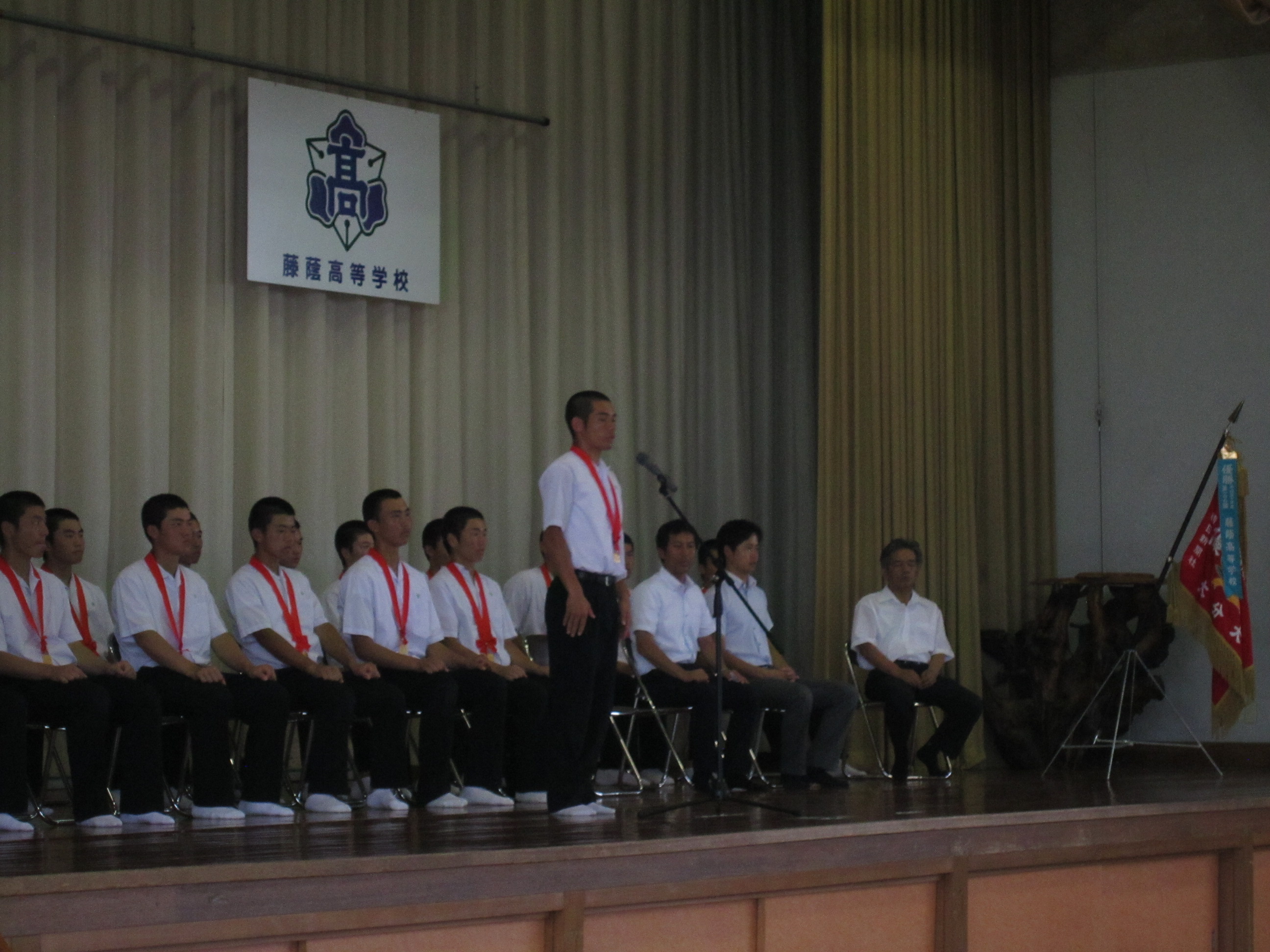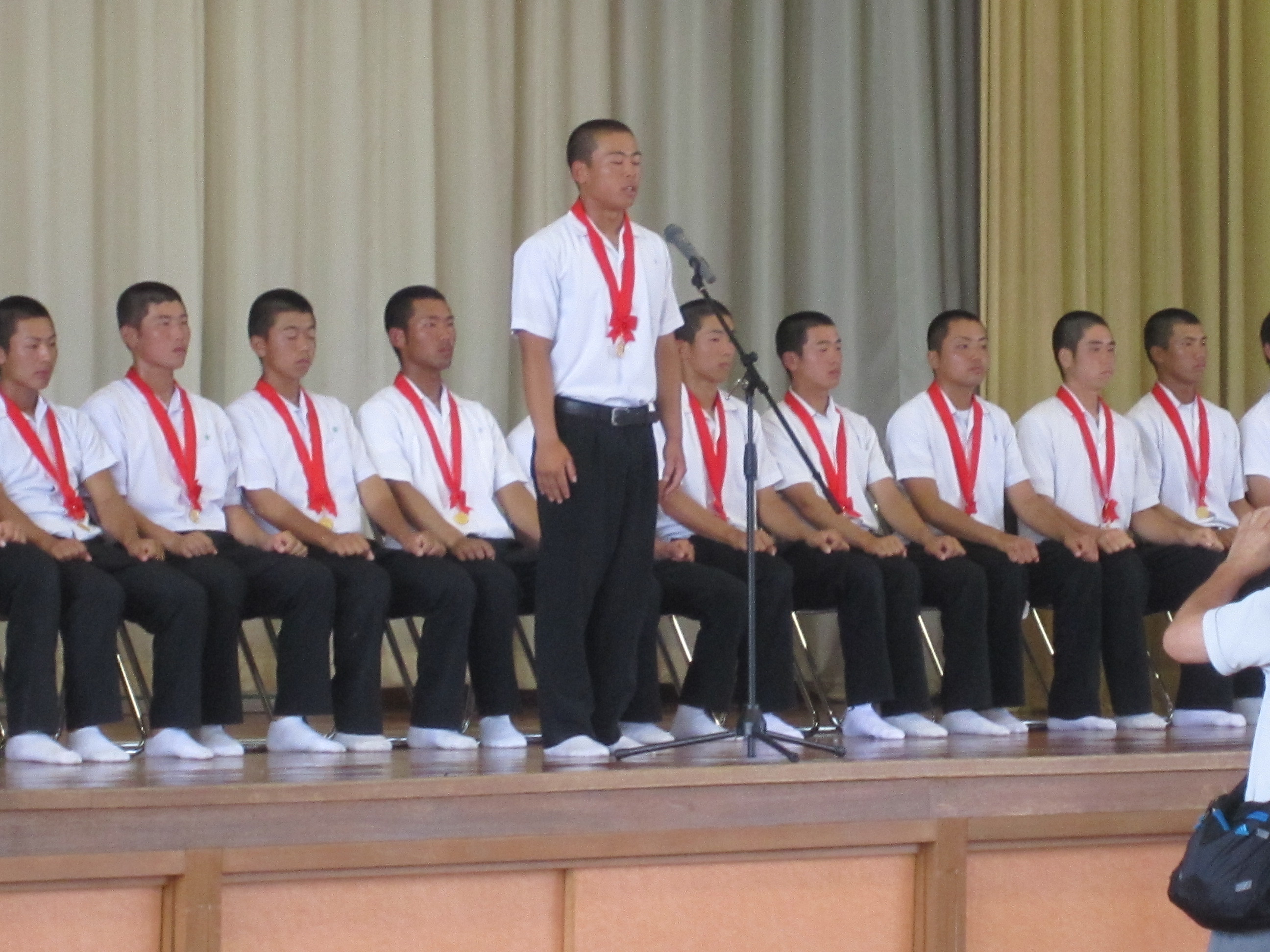 全校の生徒の前で優勝の報告と壮行会を実施しました。主将の松尾将くん(進学コース3年)が、「皆さんの